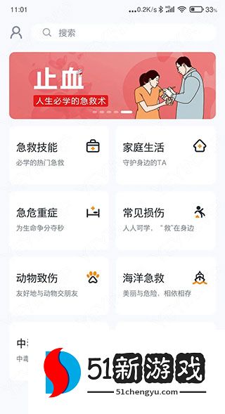 1、打开第一个界面,其中涵盖了各种急救知识,例如主页上显示的“止血”,这是每个人一生中都会遇到的。