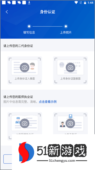 3、最后一步是上传您的身份证和医生执业证书。上传后,点击提交审核,系统后端将进行审核。一旦审核成功,就意味着注册完成。