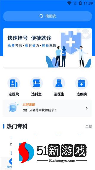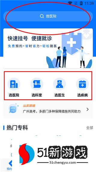 3、然后在主页上搜索医院,或直接选择医院、科室、医生,或选择疾病。