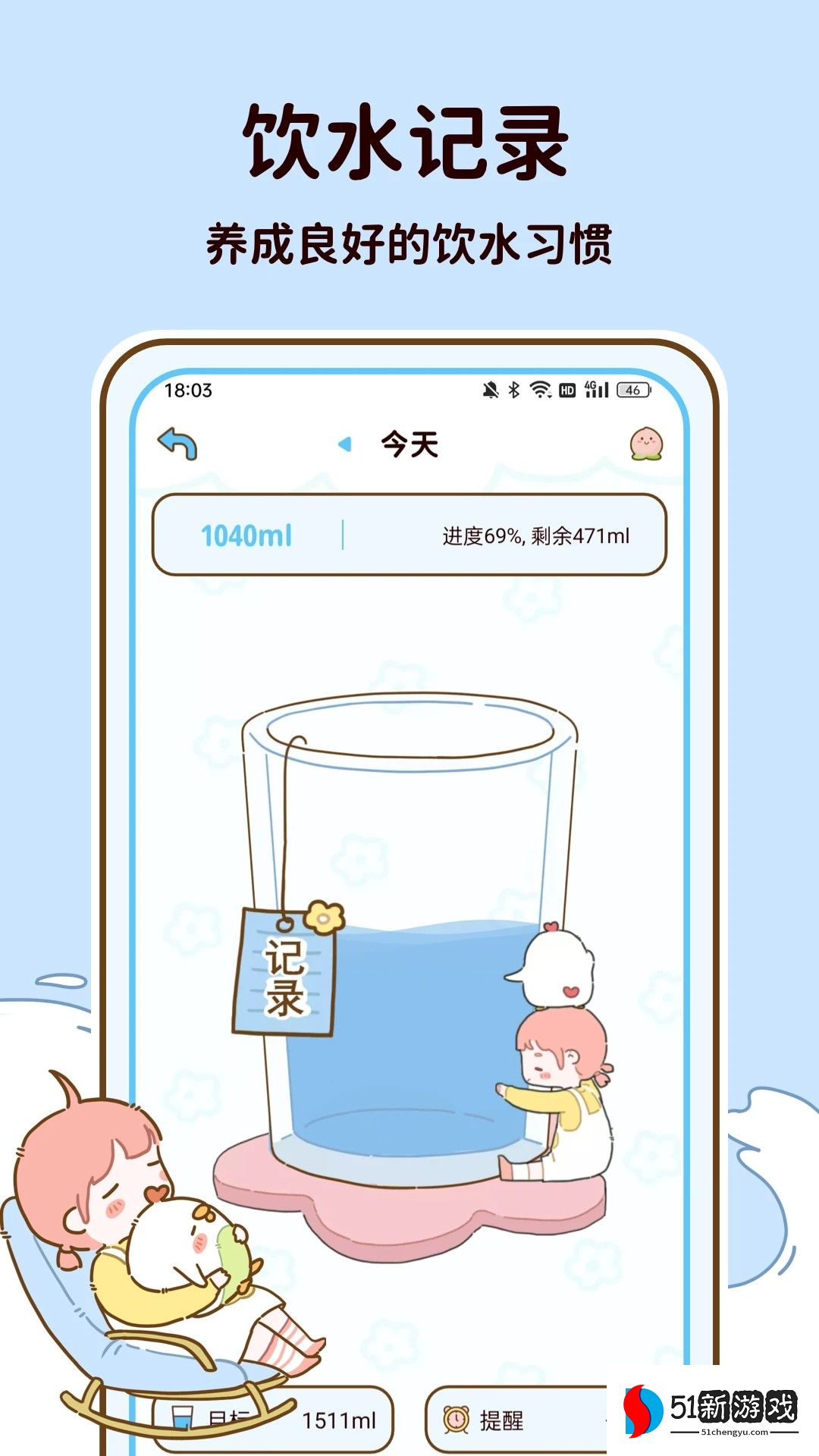 3、饮水提醒功能:对于不喜欢饮水的用户,软件会实时提醒他们饮水时间,帮助他们养成良好的饮水习惯。