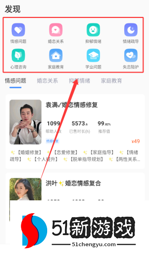 2、发现页面涵盖了情绪困扰、婚姻关系和抑郁症等专业心理咨询内容。