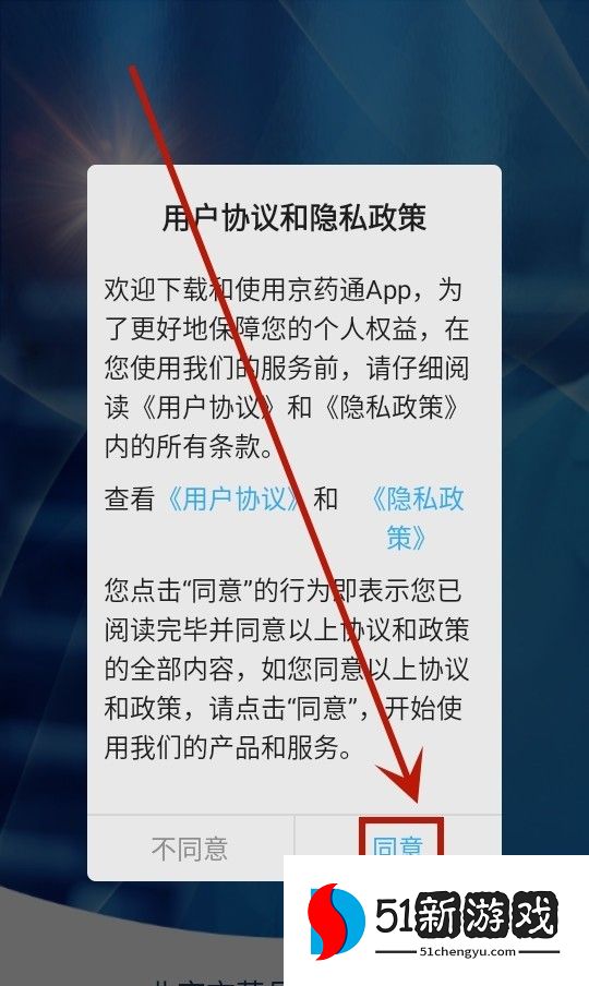 1、下载、安装并打开京药通应用程序,点击[同意]同意隐私政策。