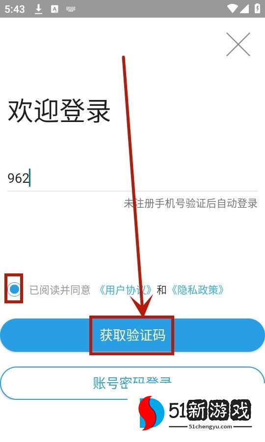3、输入您的电话号码,查看用户协议,然后点击“获取验证码”进行注册和登录。