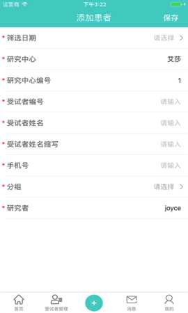 1、支持用户在线添加患者,输入和保存患者筛查日期、受试者编号和其他信息。