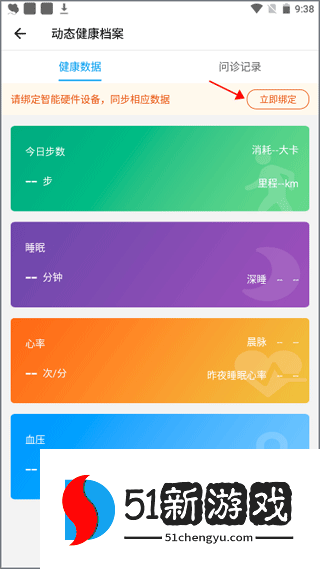2、健康数据选项卡中有一个提示,说“请绑定智能硬件设备…”单击“立即绑定”。