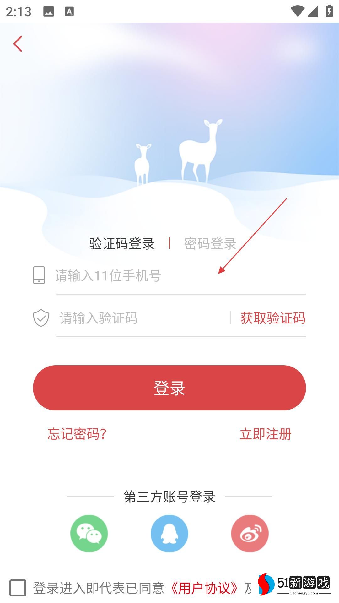2、进入登录页,有验证码、密码登录两种方式,需填手机号、验证码,可第三方账号登录,勾选同意协议后登录。