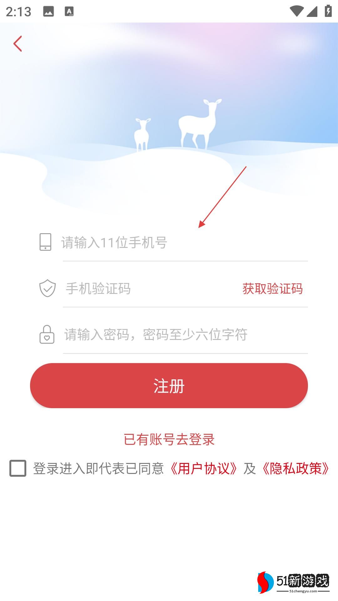 3、注册页面需填手机号、验证码、密码,点注册,已有账号可去登录,勾选同意协议完成注册。