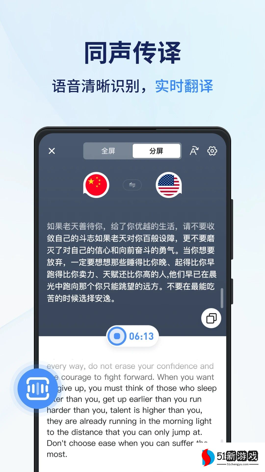 同声传译王是一款热门的精准翻译软件,拥有全面的翻译模式,可以帮助用户快速准确翻译各种语言,还采用全新的语音识别技术,随时为全球用户解决实时无障碍通信问题,自由享受便携的翻译服务,还支持英语、中文、法语、德语等,轻松实现同声传译,能完全满足所有使用需求,还用户多样化的翻译功能,包括音频翻译、文件翻译,拍照翻译等,方便用户免费应用,轻松提高翻译效率,有需要的用户欢迎来本站下载软件吧。