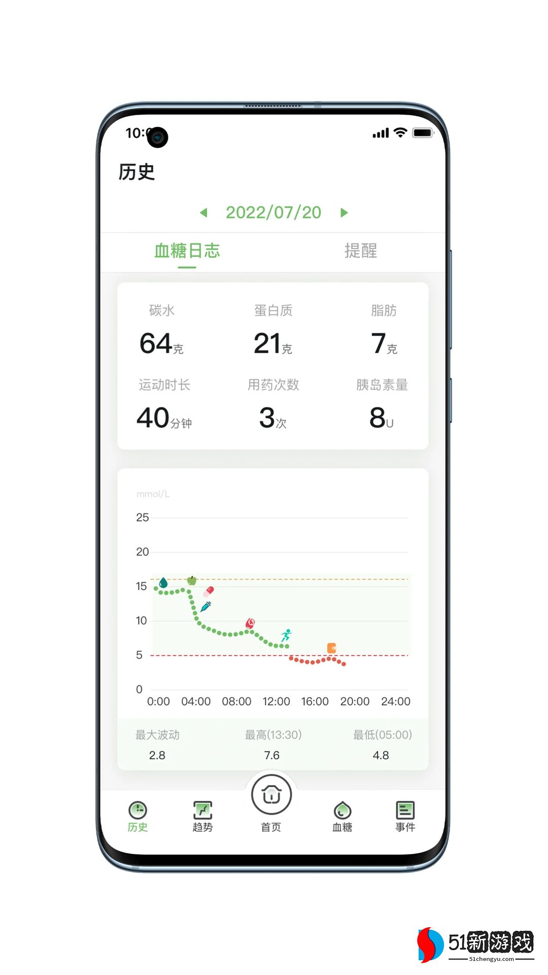 5、您可以在历史页面上查看过去的血糖数据。