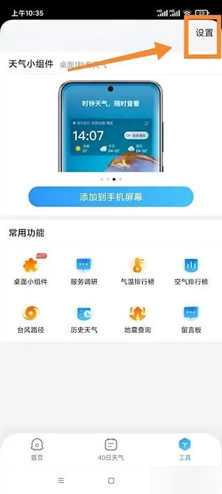 1、打开天气王应用程序,在主界面上找到工具区,点击设置功能进入。