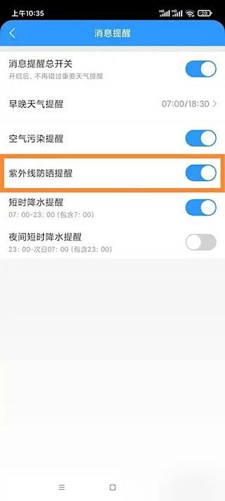 3、在消息通知界面中,找到紫外线防护提醒选项并将其打开以生效。