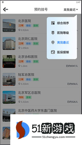 2、进入预约登记页面,选择医院,或根据要求准确选择医院。
