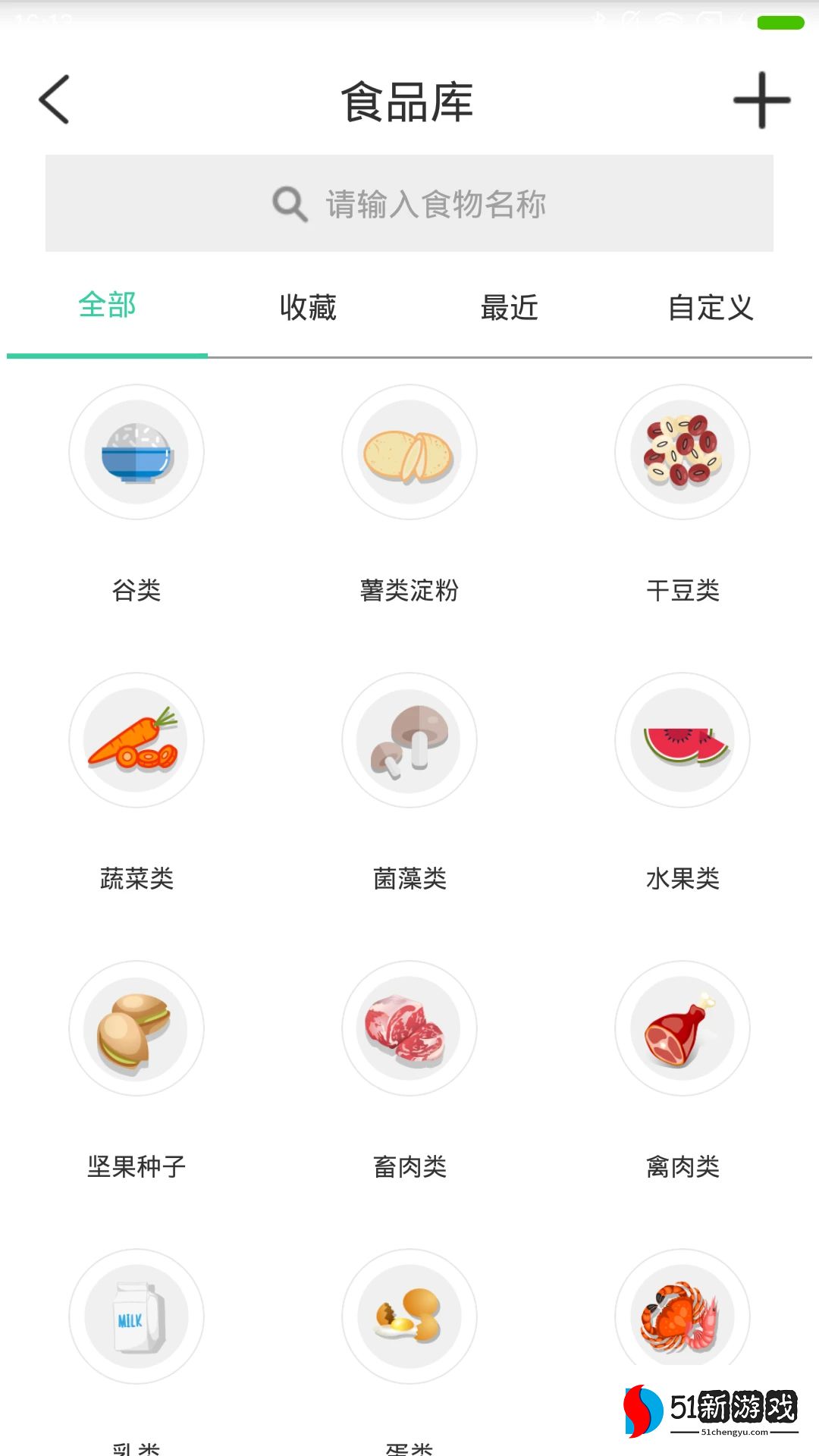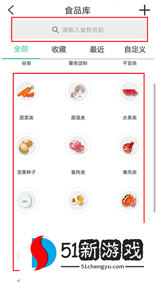 2、选择食物:进入食物库,选择相应的食物。食物库显示每100克食物的卡路里和营养成分。