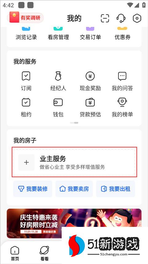 1、点击主页底部的“我的”选项,在您的个人空间中找到“我的房子”,然后点击“+”获得房主服务。