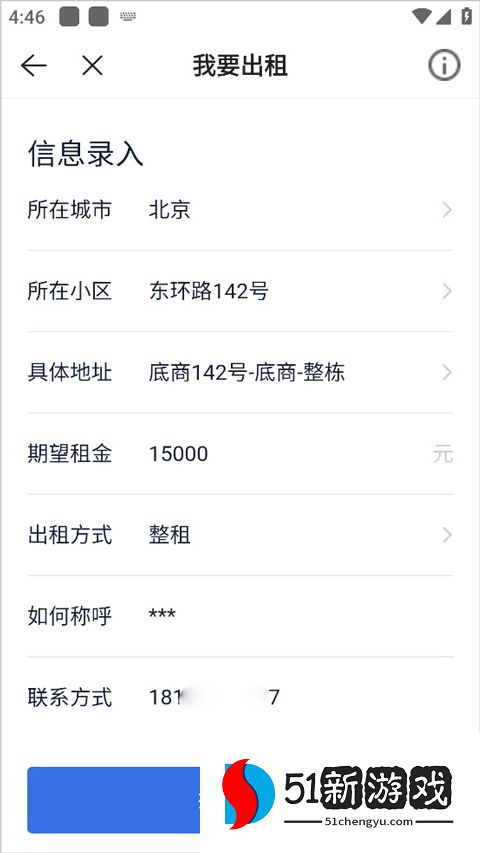 3、在此处填写信息,包括城市、社区和社区的具体地址。手动输入预期租金、租赁方式和呼叫您的另一方的名称。最后,提供了联系信息。