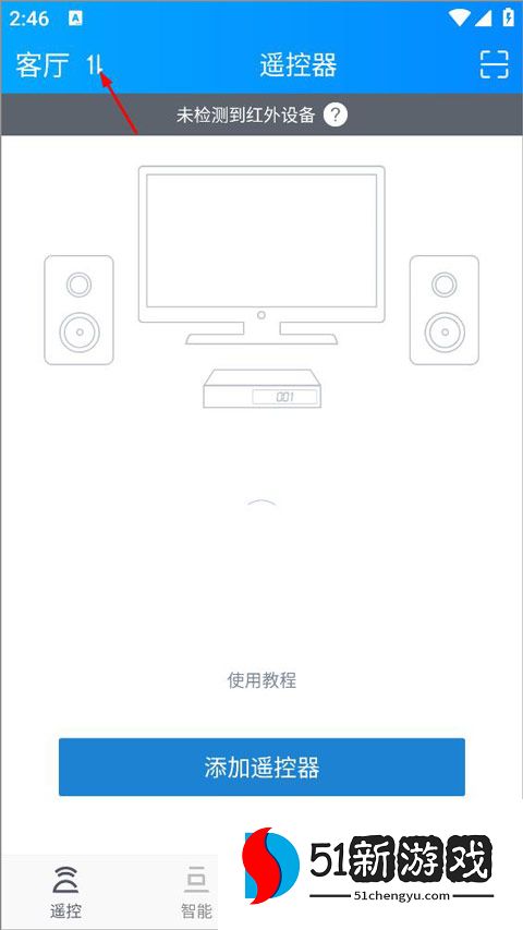 1、用户打开遥控精灵应用程序,进入遥控主页,点击左上角可在遥控室之间切换。