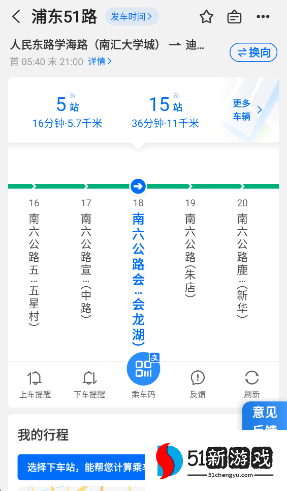 3、你可以看到蓝色箭头指示我们需要上车的车站。箭头的方向是公交车站的方向,上一站在左边,下一站在右边。