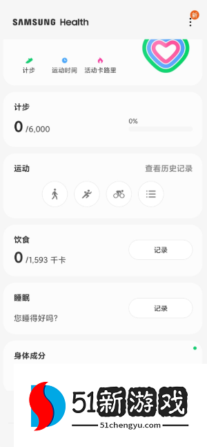 1、在本网站上下载并安装三星健康app,进入主页,您可以看到步数、运动、饮食、睡眠质量等。
