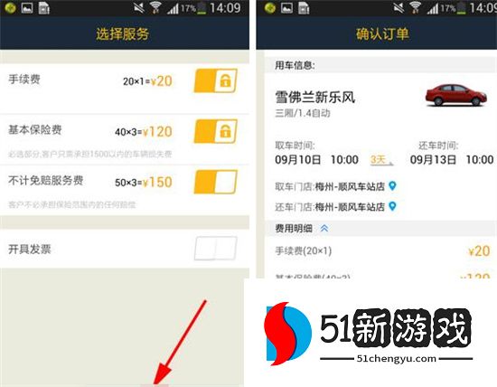 2、输入上下车信息后,点击“选车r”,选择车型,点击“租车”。