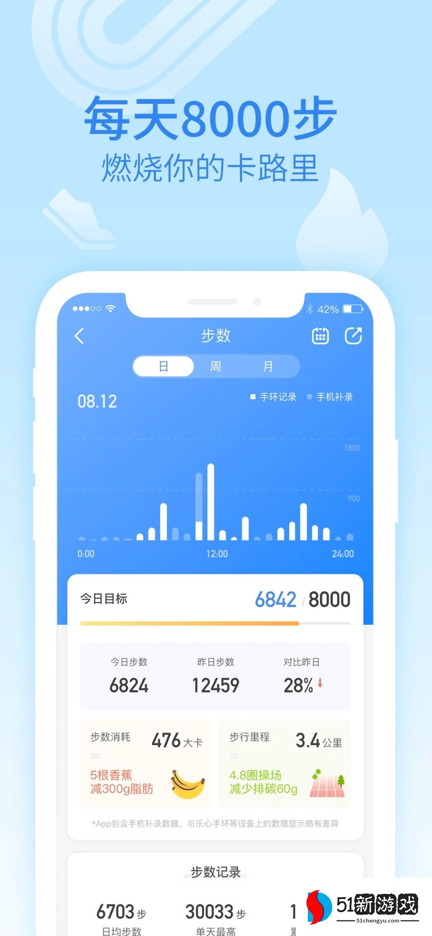 3、自动监测步行和跑步等日常活动的步数信息,并生成统计图表。通过利用智能传感技术持续跟踪运动水平,它有助于实现日常锻炼目标。