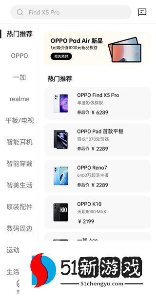 1、进入最新版本的Oppo商城软件并进入主页后,我们可以看到一些流行的产品和服务,如Oppo手机、官方直播、平板电视、原装配件等。
