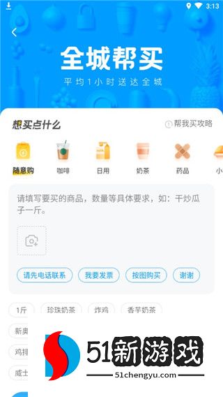 3、点击“全市帮助购买”,填写您想购买的物品,并提交等待快递将其送到您家门口。