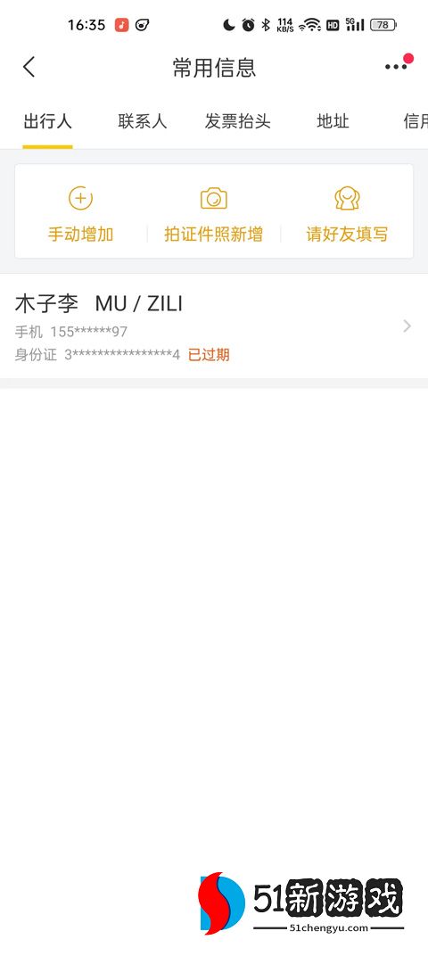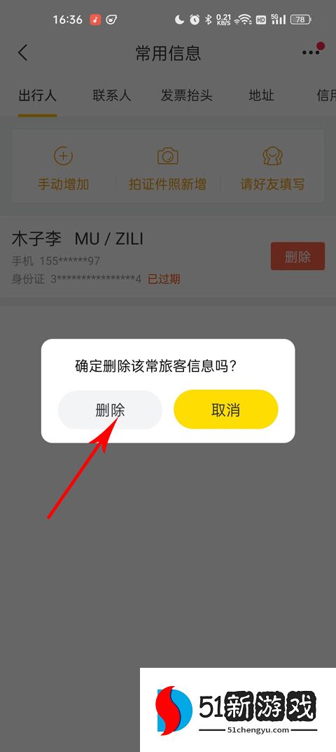 4、输入常用信息后,找到要删除的旅行者信息,向右滑动即可删除。