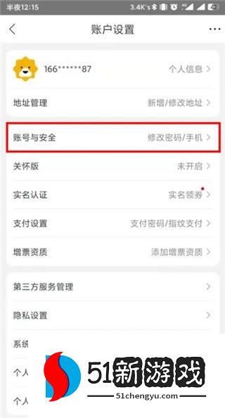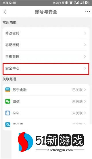 3、在账户和安全界面,找到安全中心选项,点击进入账户安全界面。