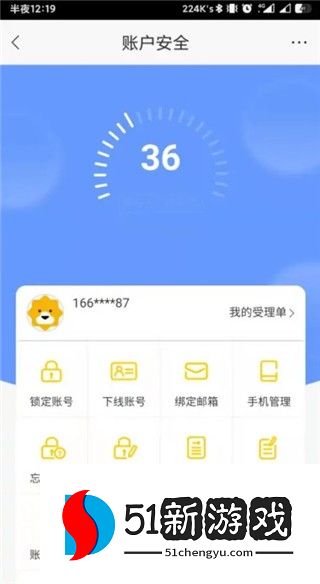 4、在账户安全界面,找到申请销户的选项,点击进入销户原因选择界面。