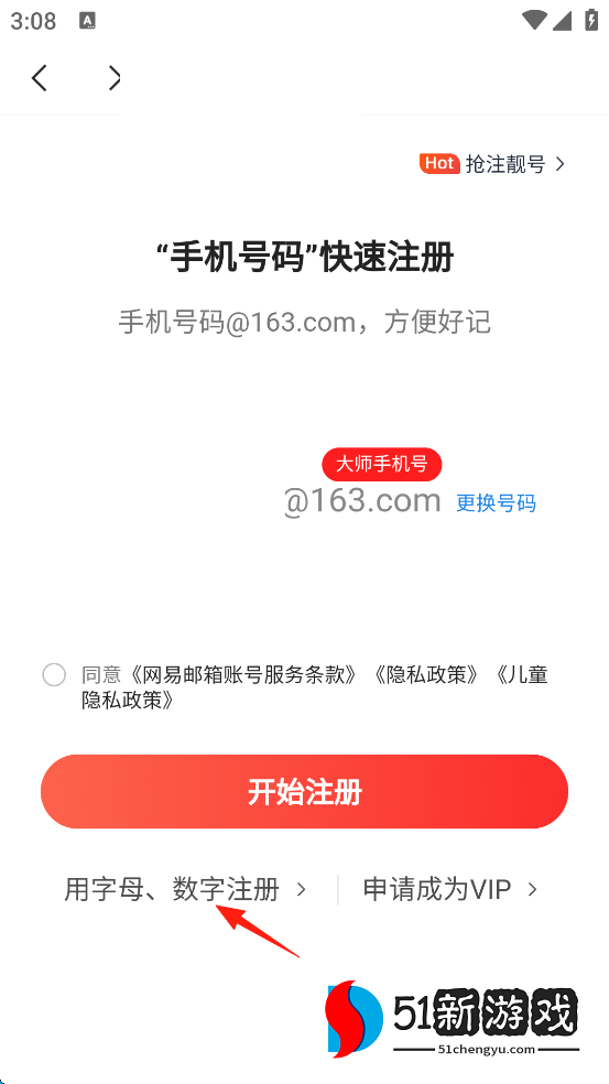 5、如果手机号没有注册邮箱,就可以手机号直接注册,方便记忆,也可以自定义邮箱,点击屏幕下方的“用字母、数字注册”。