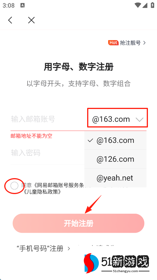 6、点击“@163.com”可以更换其他域名,随后可以自己输入用户名,勾选“同意...”,随后点击下方的“开始注册”。