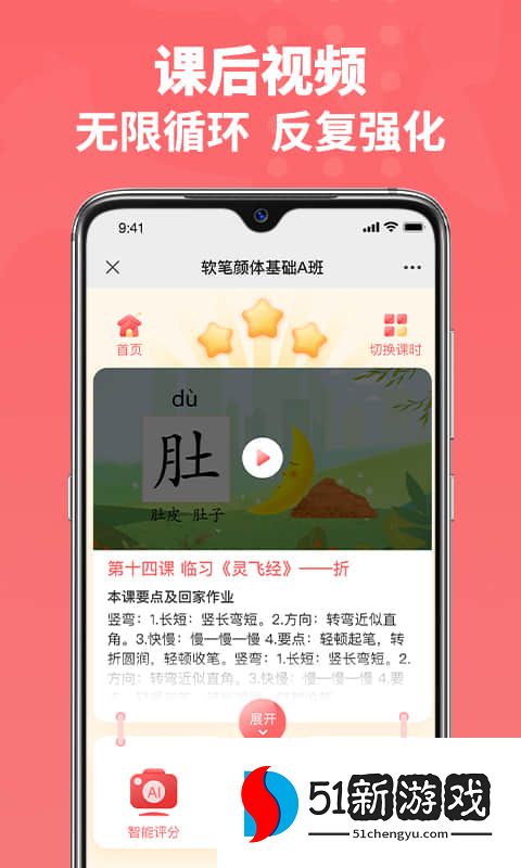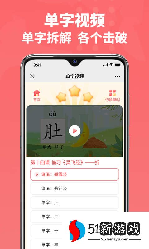 3、课程强化,通过重复播放视频的方式可以强化学习任意一个汉字。