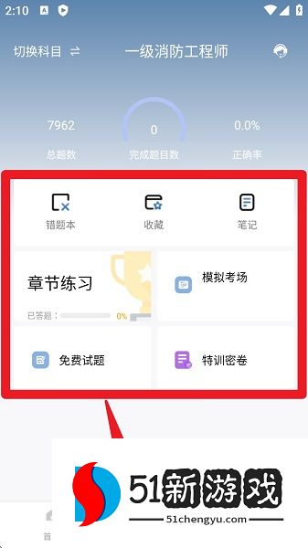2、点击下方导航栏中间的「题库」按钮,可进入章节练习、模拟考场、错题本等功能模块。