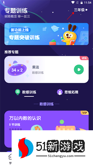 1、打开数感星球app后,在下方“专题”界面,点击当前的年级。