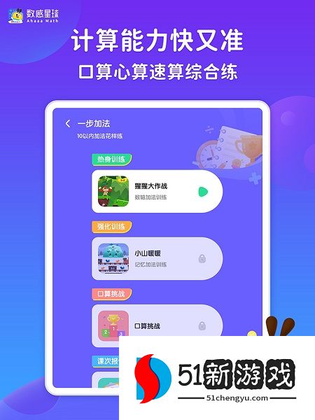 数感星球是一款适合3~10岁孩子的数感计算训练软件,为孩子提供游戏化、系统化、轻量化的数学思维训练。将严谨的数学知识和趣味游戏相结合,为孩子构建一个多元的数学问题探索空间,循序渐进引导孩子主动解决问题,从而深刻理解抽象的数学原理,为数学学习打下稳固的基础。软件中包含了3大训练专题、4大训练模式,超过110+知识单元、5000+训练内容,根据人教版教材制作,能有效地帮助孩子拓展新知识、巩固老知识。