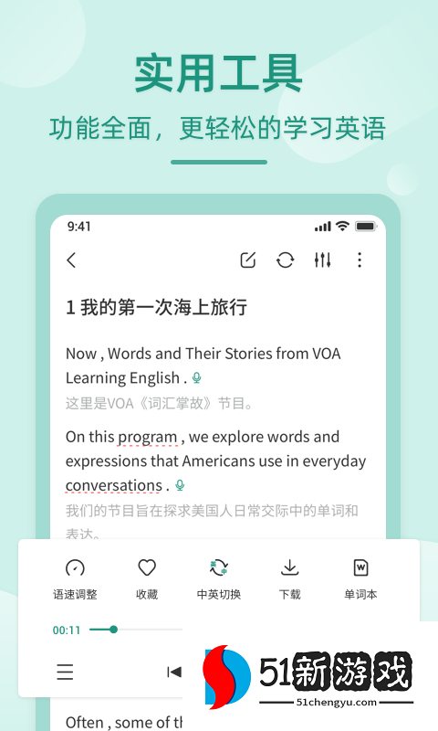 2、智能变速播放:支持0.5x-2.0x无损变速调节,允许慢速密集听或快速广泛听,满足不同学习阶段的需求。