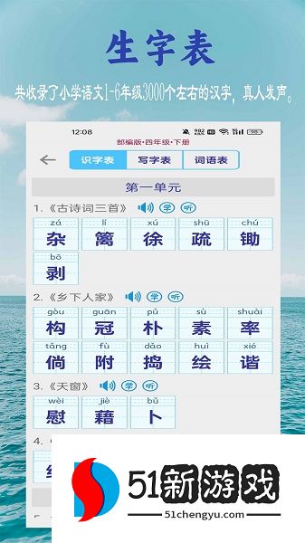 1、教材同步:完全包含在小学一至六年级语文教材的字符列表中,按课程和单元精确匹配,便于即时学习和练习。