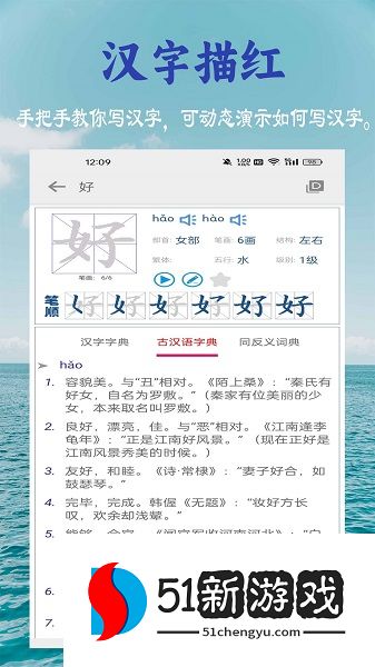 2、汉字描红,教你学写汉字。手把手教你写汉字,可动态演示如何写汉字。