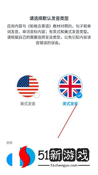 1、进入发音类型选择页面,选择英式发音选项,点击确定选择按钮,完成默认发音类型的设置。