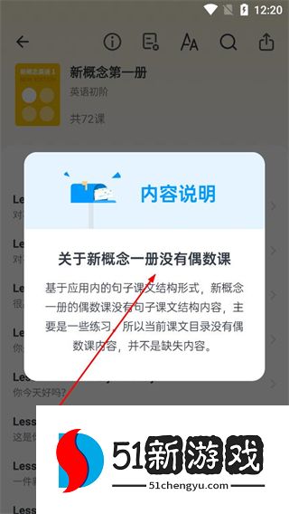 3、在课程页面查看内容说明,了解新概念一册没有偶数课的原因,明确课程内容的设置情况。