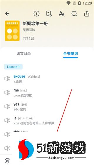 4、切换到全书单词页面查看Lesson1的单词列表,点击播放按钮,收听单词的发音进行学习。