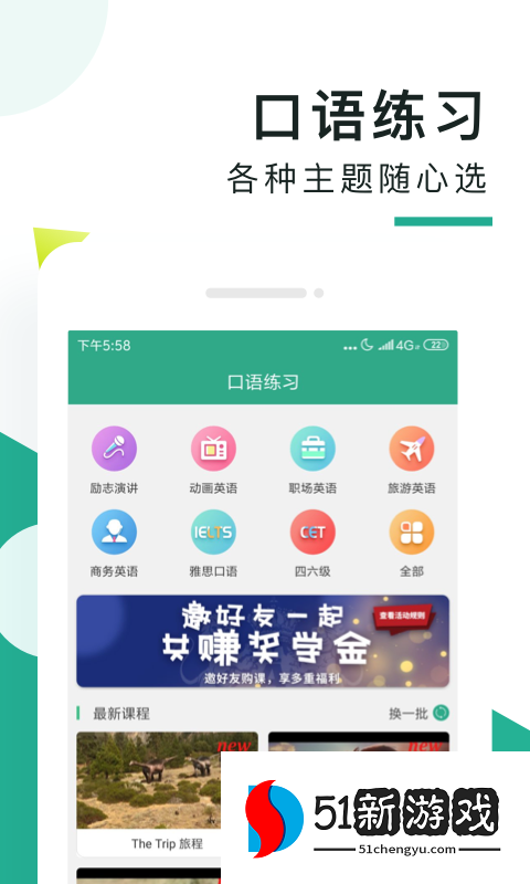 阿卡索口语秀是一款受欢迎的英语口语学习软件,采用自主口语学习模式,可以为用户提供新颖有趣的学习乐趣,寝室提高用户英语水平和能力,还拥有各种英语视频和课程,包括励志演讲、商务英语、日常雅思口语练习等,随时随地自由选择浏览,轻松掌握全面的英语知识,能完全满足所有学习需求,还具有独家的智能口语评分系统,轻松为用户提供练习分数和纠正发音错误,帮助您更快地提高口语技能,有需要的用户欢迎下载软件。