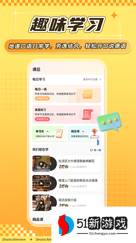 3、趣味学习:地道口语日常学习,劳逸结合,趣味学习,在趣味学习中感受德语能力提升。