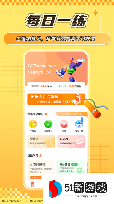 1、AI智能学习:每日一练,跟着老师学德语,沉浸式高效学习,科学有效地提升学习效果。