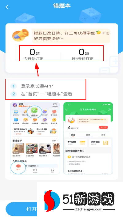 2、然后在这里你可以看到今天和过去三天需要纠正的错误问题的数量,或者你可以登录育儿应用程序进行查看和纠正。