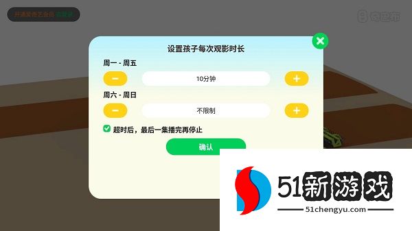3、同时,家长也可以设置观看时间,根据时间段可分为周一至周五、周六至周日。时间限制可分为无限制、10分钟。