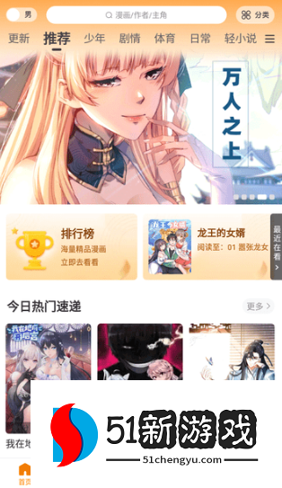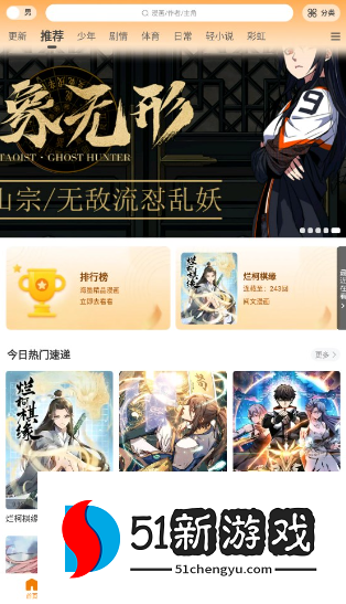 1、进入首页后,可以在上方菜单栏左右移动选择喜欢的类型,也可以点击【排行榜】查看目前最火的漫画等等。