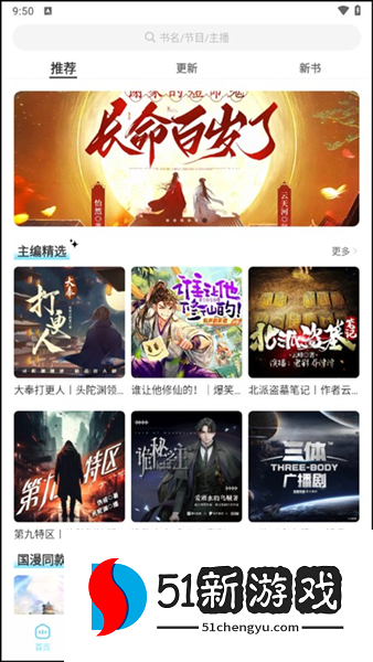 2、主页有明确的分类,如推荐、更新和新书,涵盖了有声小说、相声、广播剧和音乐等多种类型。流行小说很容易满足不同用户的不同需求。