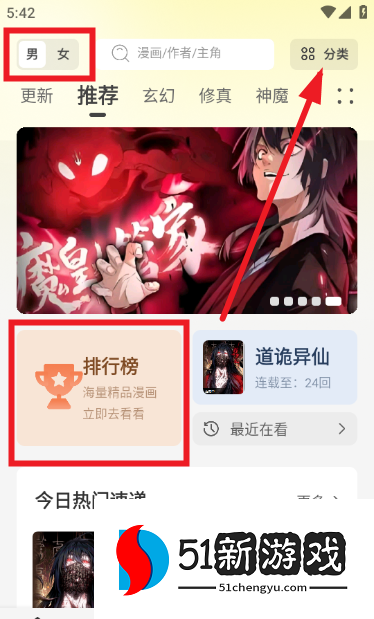 1、所有漫画都是免费的,一旦你进入软件,你就可以在男性和女性模式之间自由切换。还有一些类别可以过滤你最喜欢的漫画,你也可以查看排名等。