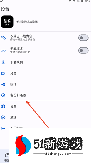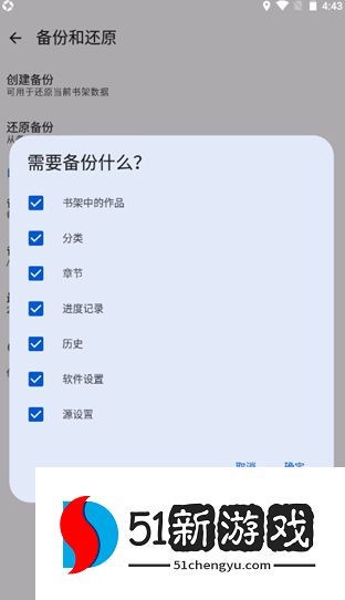 4、点击创建备份后,还能选择备份的作品类型,章节、历史、分类、源设置等等。